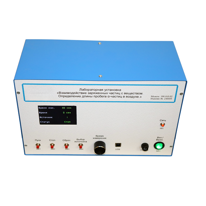 Учебный лабораторный стенд «Взаимодействие заряженных частиц с веществом. Определение длины пробега альфа-частиц в воздухе» (далее стенд), предназначен для проведения лабораторных работ с учащимися по курсу ядерная физика.
